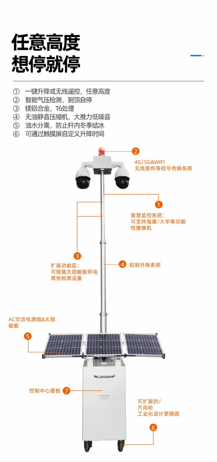 友聯(lián)哨兵多功能移動兵站-輕便型移動監(jiān)控 友聯(lián)哨兵多功能移動兵站(輕便型小哨兵移動監(jiān)控)是一款十分靈活的中小型移動監(jiān)控設備,自帶網(wǎng)電,具備較高的機動性,系統(tǒng)可集高清視頻監(jiān)控、照明、報警、廣播、對講、氣象環(huán)境監(jiān)測、存儲、控制、無線傳輸、一鍵升降等功能于一體,并可具備市電、太陽能等多種能源補給方式,提升續(xù)航時間,以適應各類復雜的環(huán)境。戶外使用,不懼風雨,隨需移動,循環(huán)利用??蓮V泛用于石油管道巡檢、工地監(jiān)控、電力維修監(jiān)控、活動安防、戶外作業(yè)等臨時監(jiān)控或長期監(jiān)控。