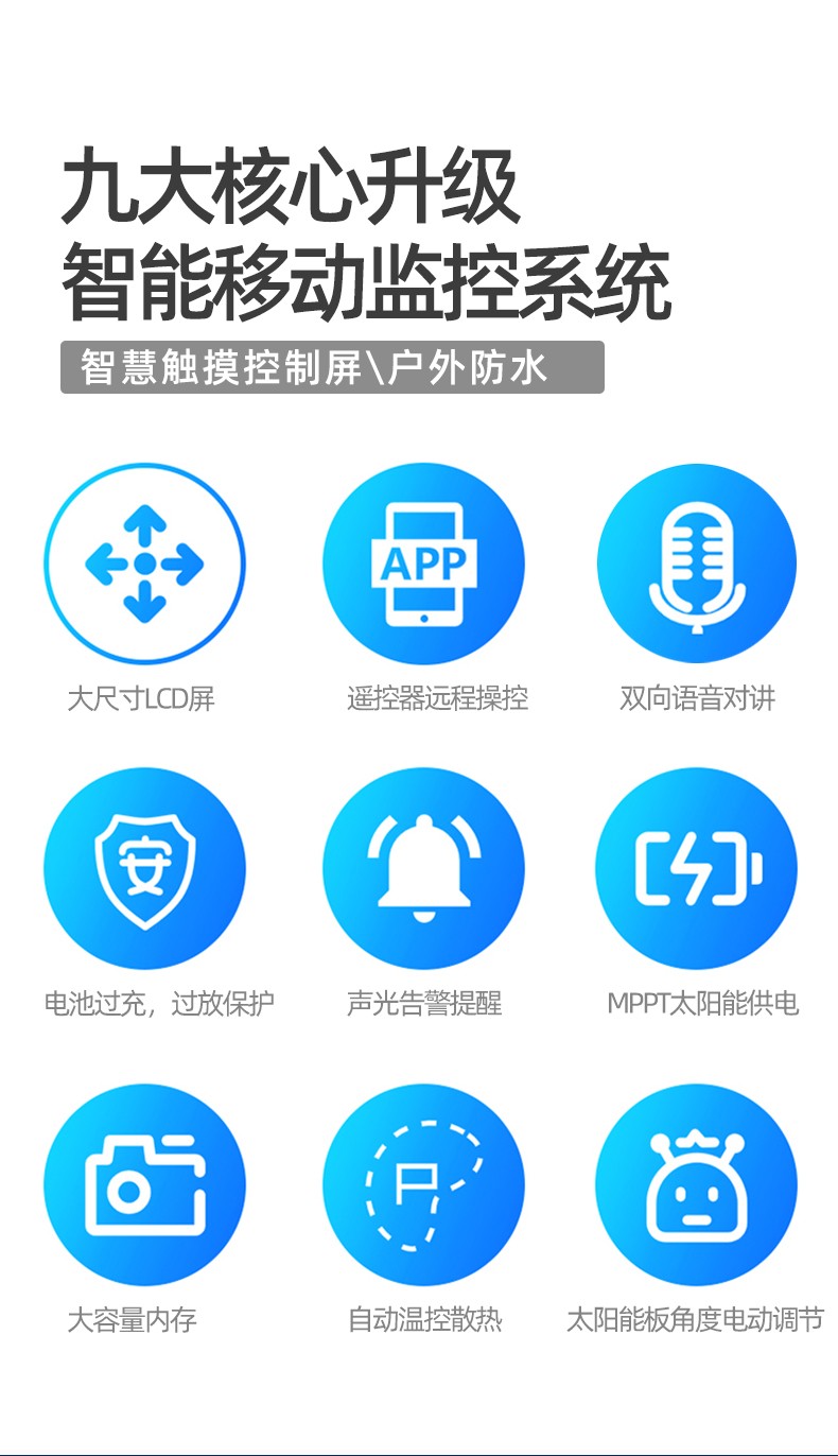 小哨兵移動監(jiān)控系統(tǒng)太陽能電池供電超長續(xù)航便捷監(jiān)控 友聯(lián)哨兵多功能移動兵站(輕便型小哨兵移動監(jiān)控)是一款十分靈活的中小型移動監(jiān)控設備,自帶網(wǎng)電,具備較高的機動性,系統(tǒng)可集高清視頻監(jiān)控、照明、報警、廣播、對講、氣象環(huán)境監(jiān)測、存儲、控制、無線傳輸、一鍵升降等功能于一體,并可具備市電、太陽能等多種能源補給方式,提升續(xù)航時間,以適應各類復雜的環(huán)境。戶外使用,不懼風雨,隨需移動,循環(huán)利用??蓮V泛用于石油管道巡檢、工地監(jiān)控、電力維修監(jiān)控、活動安防、戶外作業(yè)等臨時監(jiān)控或長期監(jiān)控。